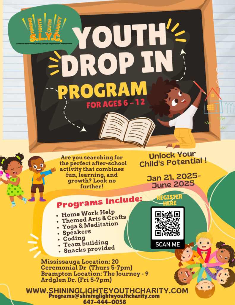 Youth Drop In Program offers young people 6 to 12 years of age a safe space to learn interpersonal skills, receive school assistance and mentorship while being exposed to different topics and fields that will broaden their horizons.